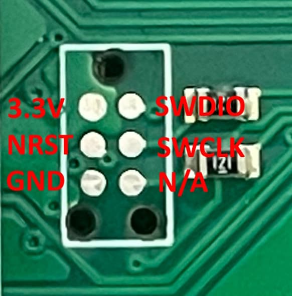 I got in touch with J from the Fungineers, who kindly provided the Serial Wire Debug (SWD) pinout for the Thor 300 ESC. The six debug pads are designed for use with a Tag-Connect TC2030-IDC-NL (or similar), but you can also solder temporary wires and use a ST-Link programmer, available on Amazon for under $10.